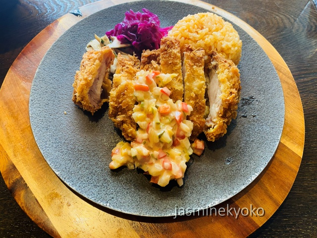 ↑チキンカツ定食にした。1380円にスープとサラダで+500円。計1880円。